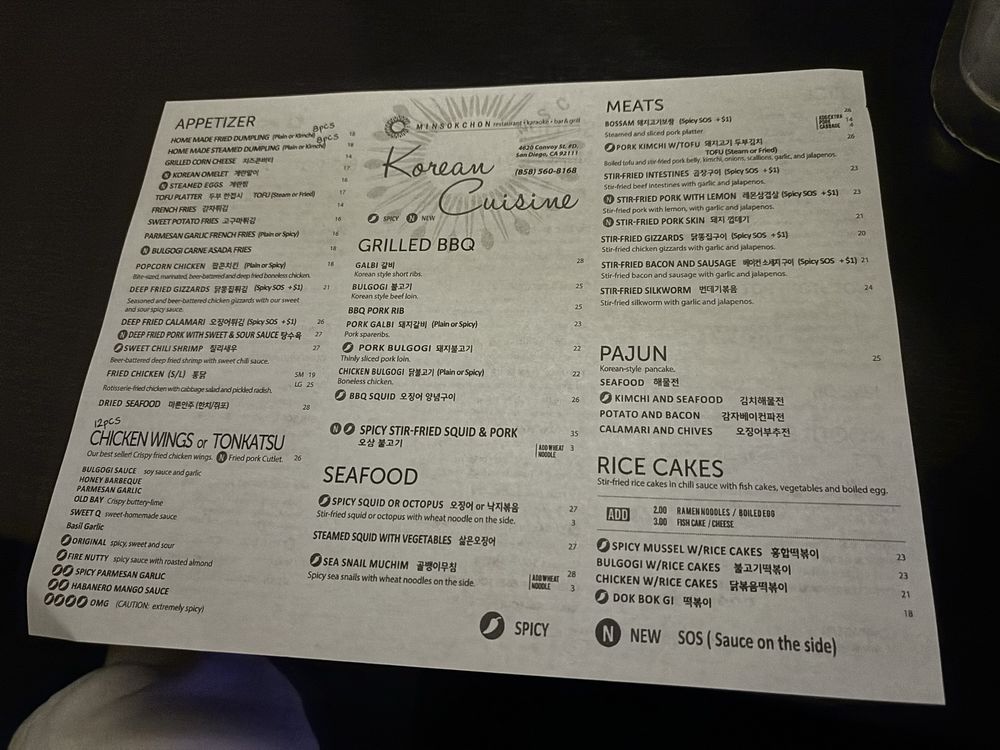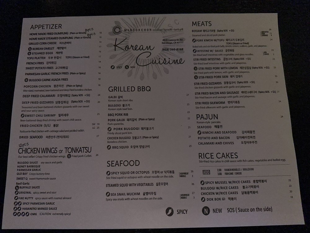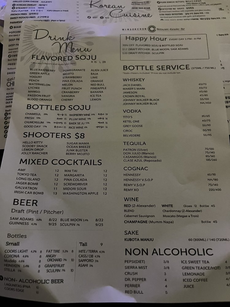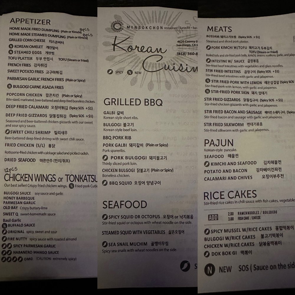 Min Sok Chon in San Diego offers a vibrant mix of Korean cuisine, karaoke, and a lively atmosphere. The menu boasts a wide array of options, including fan favorites like kimchi fried rice and unique dishes like intestines. Customers praise the food for its flavor and generous portions, with standout dishes like the Kimchi Jjigae and Veggie Bibimbap with tofu. The restaurant's late-night hours and happy hour specials make it a popular spot for night owls looking to enjoy Soju and delicious food. The casual, bustling ambiance is perfect for group gatherings or a fun night out. With a range of amenities like private karaoke rooms and attentive service, Min Sok Chon promises a memorable dining experience for those craving authentic Korean flavors and a lively setting.